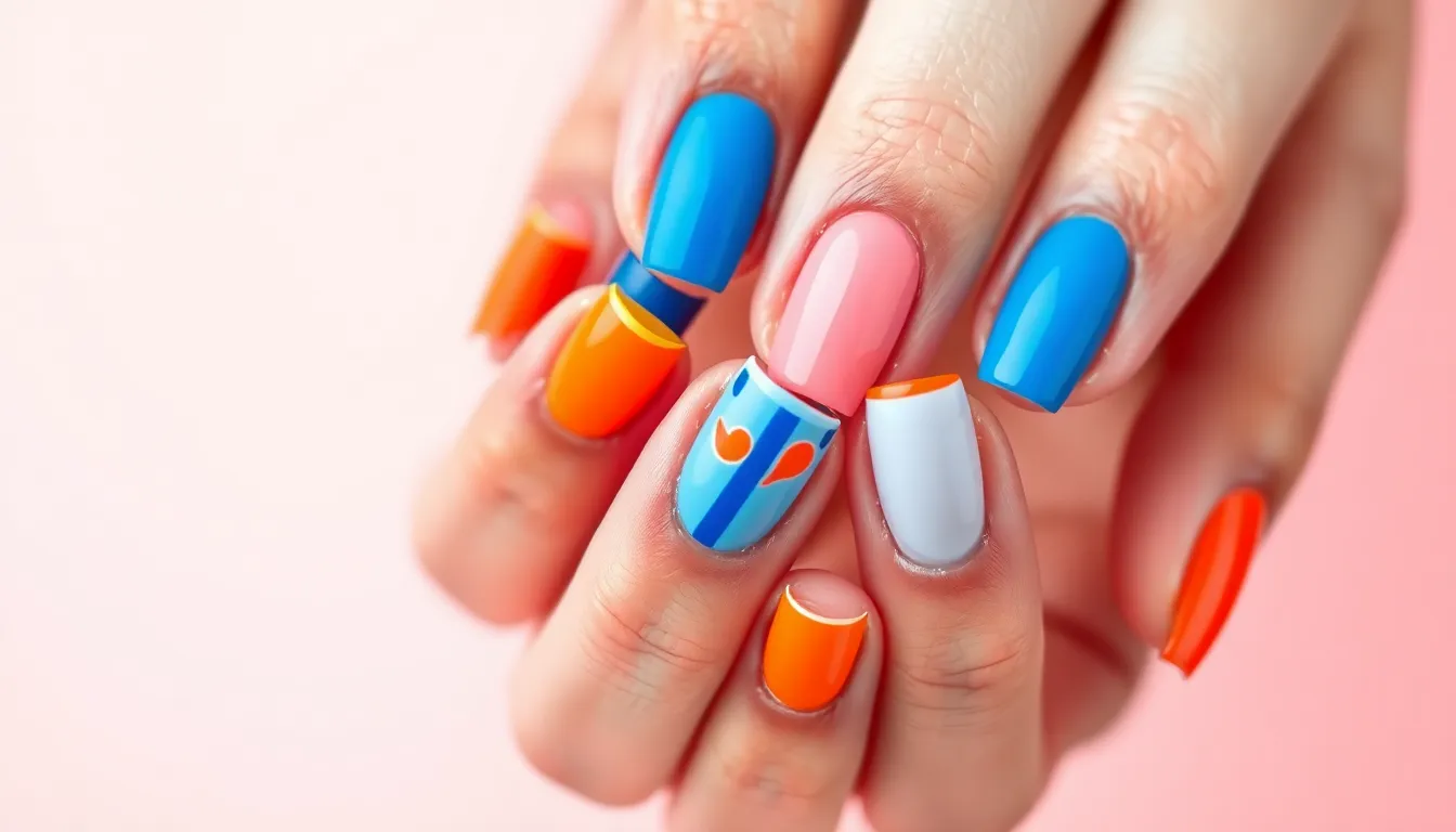 Combining contrasting colors creates dynamic nail art that intrigues the eye. Black and white remain a classic pairing that exudes elegance and modernity. Bright pink combined with deep green generates a playful yet striking look, ideal for summer. Pairing royal blue with a soft yellow produces a cheerful effect, perfect for casual outings. Another bold duo includes purple and orange, bringing vibrant energy to the nails while showcasing creativity and fun.